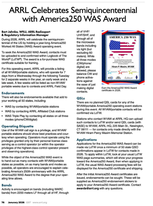 To find out more about the W1AW/** Special Event Stations click on this link HERE. https://www.arrl.org/america250-was On the ARRL website you can check the weekly state activation schedule for each state. A “Triple Play” award is available for working W1AW/** in all 50 states on Voice, CW and Digital.